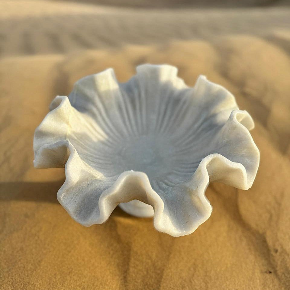The Aavya Centerpiece by Tohfa Luxe is a quiet marvel of form and feeling, hand-carved from a single block of pristine white marble. With sweeping, ruffle-like edges reminiscent of desert blooms and ocean waves, Aavya captures movement in stillness—offering both sculptural beauty and soulful depth.