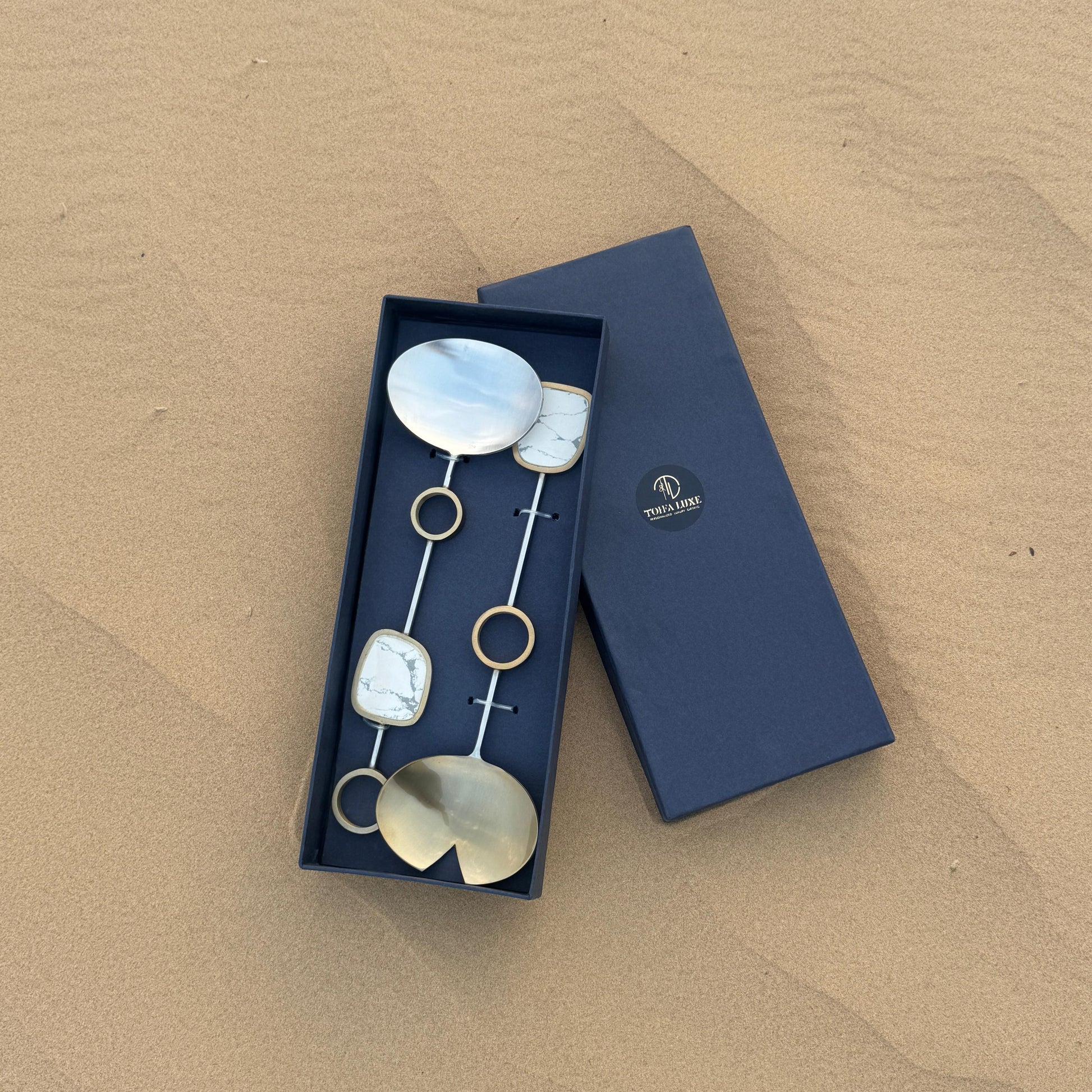 Crafted from high-quality stainless steel and resin, this 31 × 13.5 cm set is not only visually striking but also durable and comfortable to use. The metallic finish contrasts beautifully with the resin inlay, creating a balance of elegance and contemporary design.