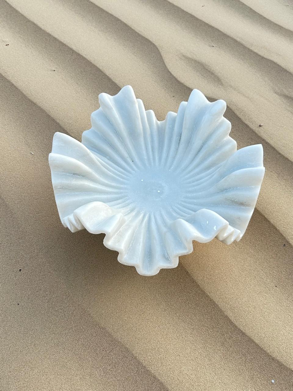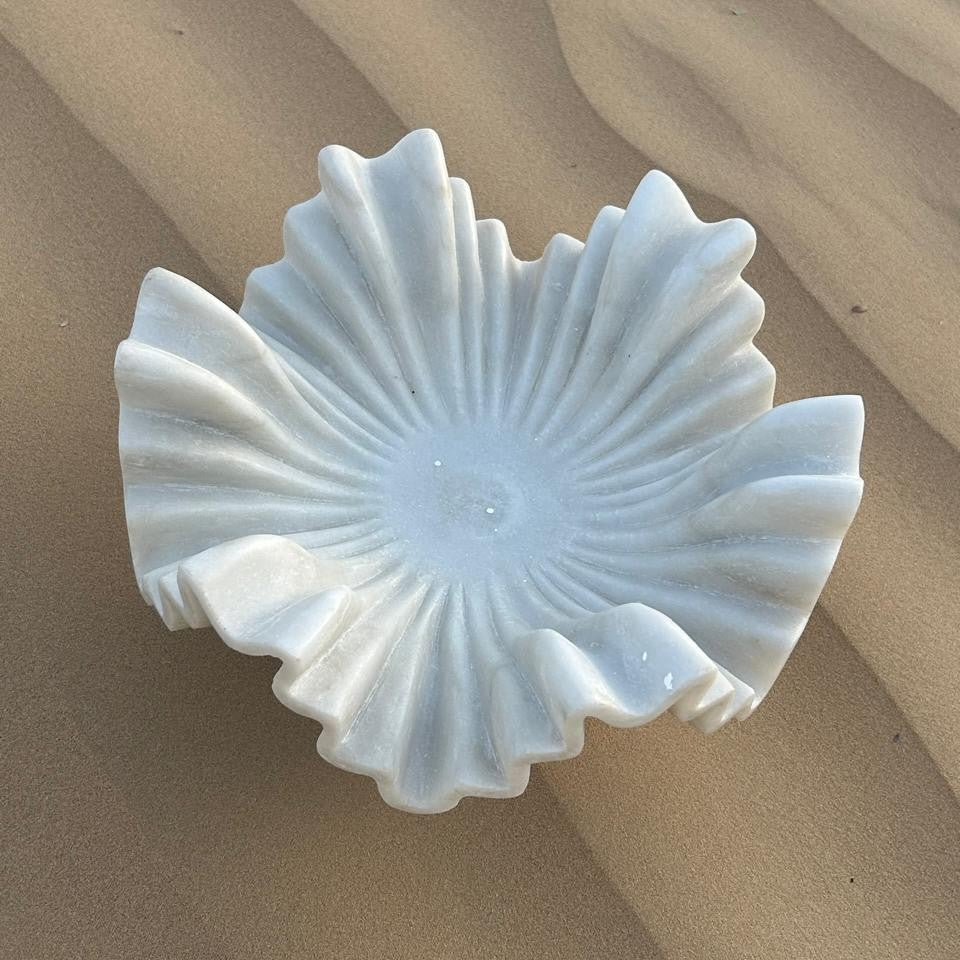 Meet Eira—a marble centerpiece where edge meets elegance. Hand-carved from a single block of luminous white marble, this striking 6 kg sculptural piece from Tohfa Luxe captures the drama of nature in motion. With sharply fluted ridges and confidently contoured edges, Eira evokes the fluidity of wind-sculpted dunes and the poise of petals mid-bloom.