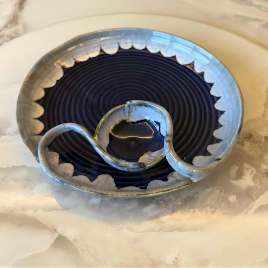 Bold, artistic, and unmistakably refined, Tohfa Luxe Ayla is a statement handcrafted ceramic chip & dip platter designed for elevated entertaining. Finished in a deep indigo glaze with delicately hand-finished edging, this piece draws inspiration from lunar curves, celestial rhythm, and fluid movement.
