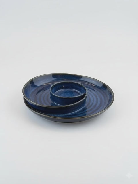 Finished in rich midnight blue tones with a fluid, naturally flowing glaze, each piece carries subtle variations that make it truly one of a kind. The integrated central dip bowl blends seamlessly into the platter, offering effortless functionality while maintaining a refined, artistic silhouette.