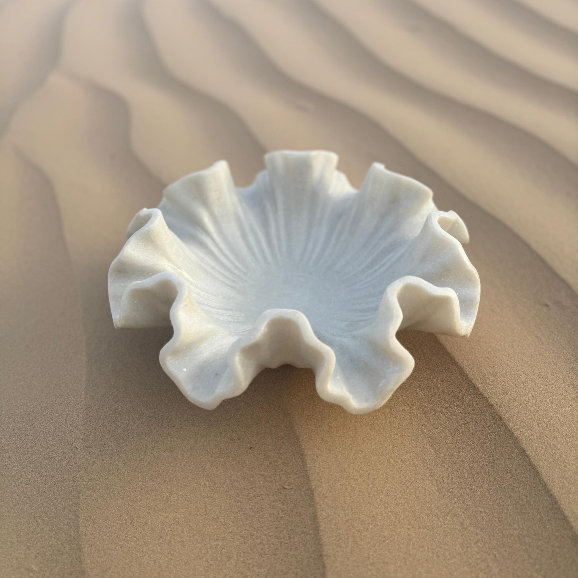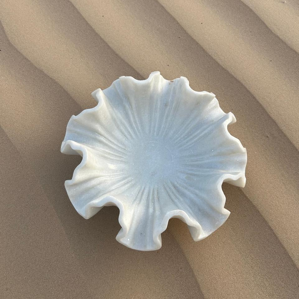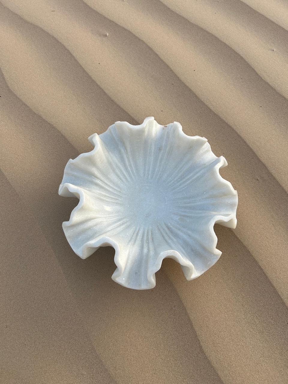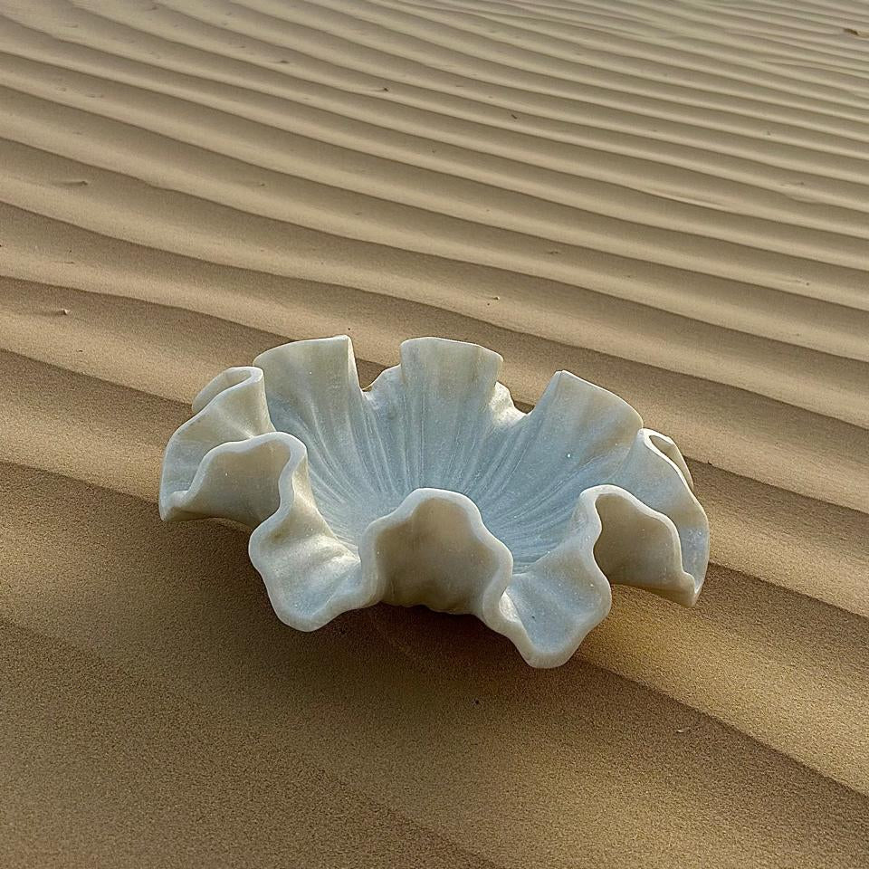 Introducing Miraq—a sculptural marble creation where serenity meets functionality. Carved by hand from a single block of pristine white marble, Miraq’s fluid edges and radiant form evoke the delicate ripple of petals unfolding, or water catching the light in a still pool.