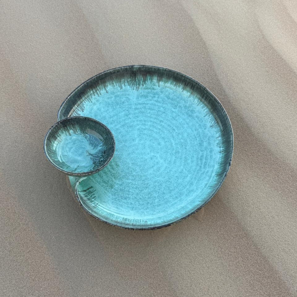 Inspired by the gentle flow of nature and the tranquility of verdant landscapes, the Nahla Platter blends elegance with functionality. Handcrafted by skilled artisans, this dual-purpose ceramic platter features a built-in dip bowl and a soothing light green glaze, creating a captivating centerpiece for intimate dinners or festive gatherings.