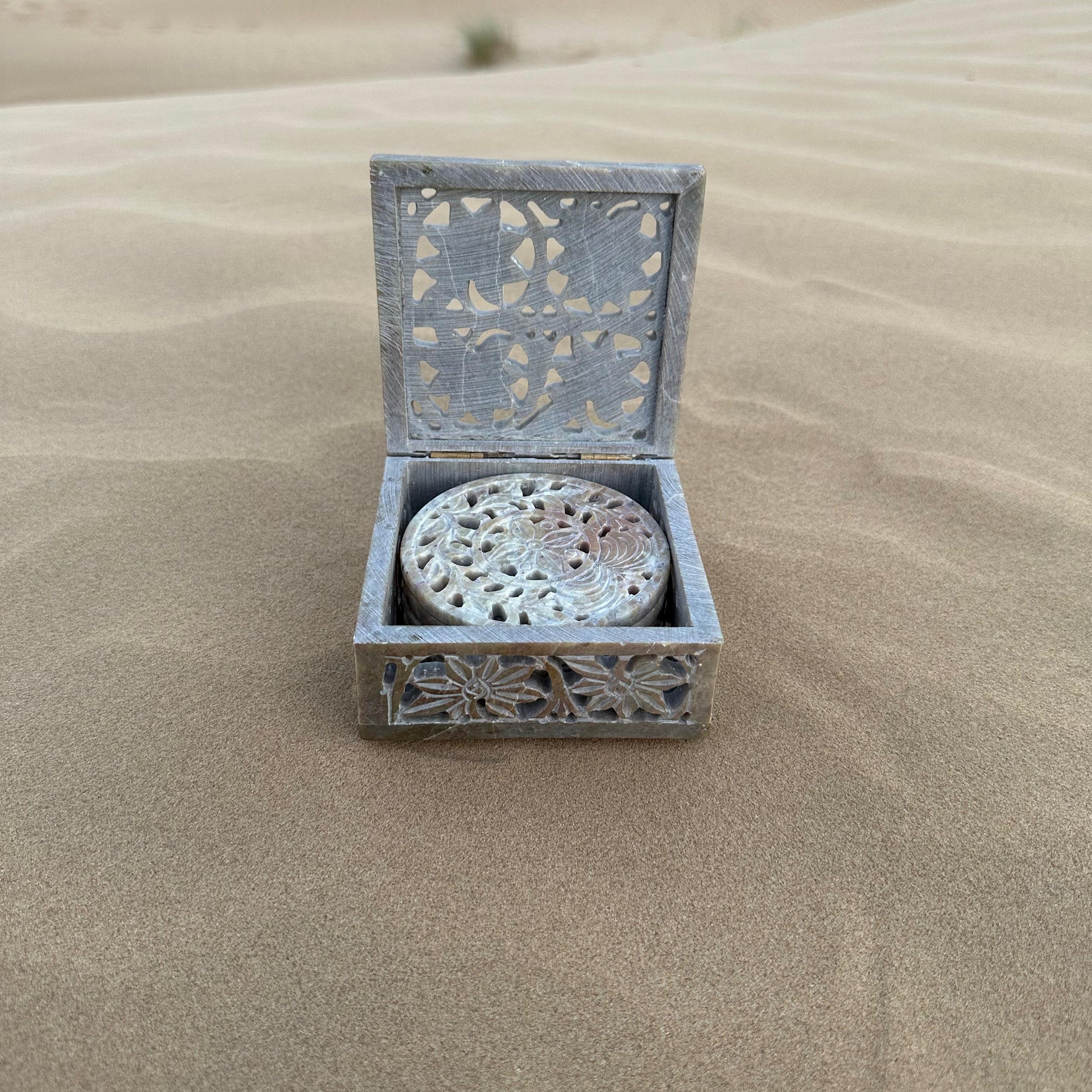 Bring timeless craftsmanship and everyday elegance into your home with the Palm Cutwork Marble Coaster Set by Tohfa Luxe. Handcrafted from natural marble, this exquisite set includes four round coasters and a beautifully carved square marble box with lid for stylish storage.