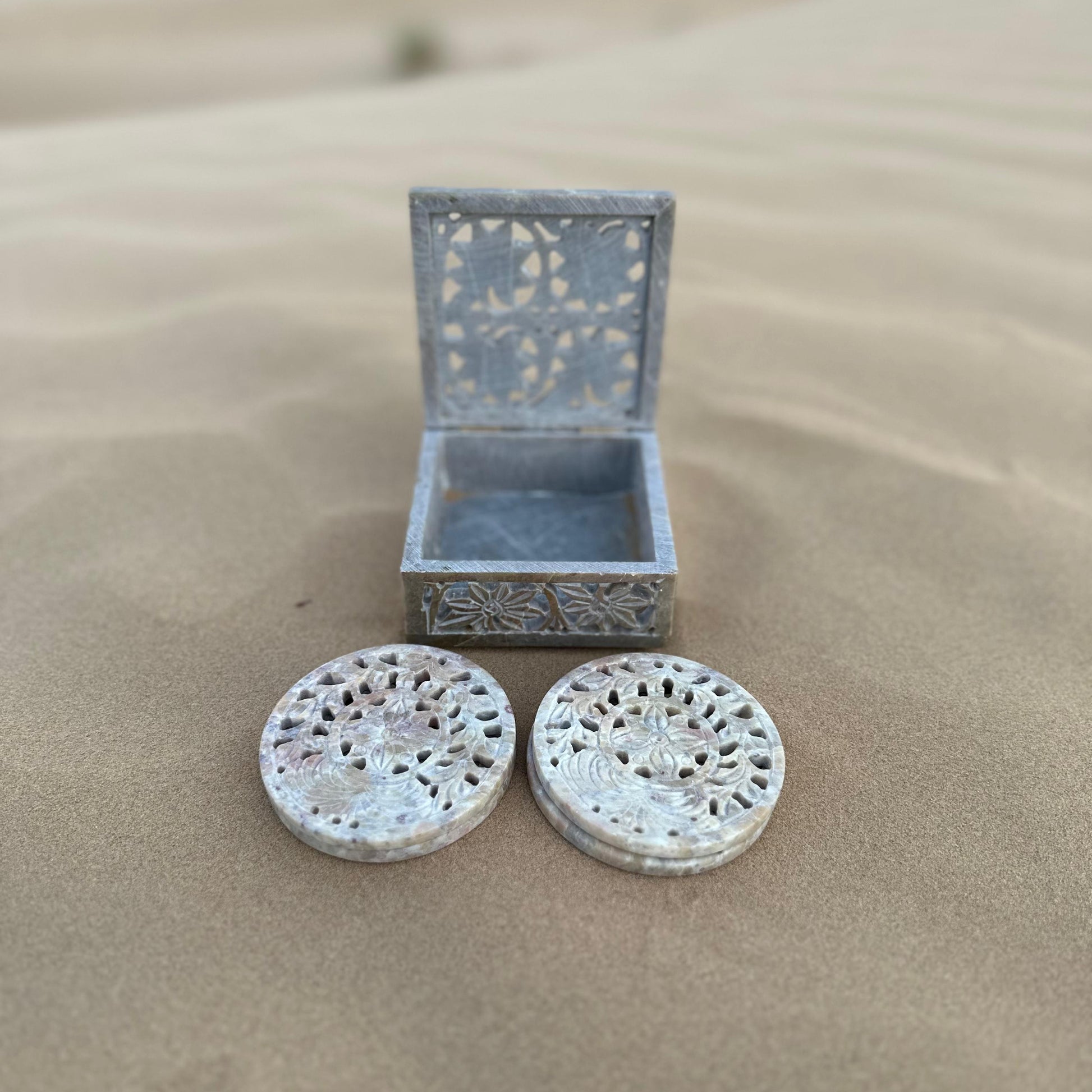 Includes: 4 round coasters (7.5 cm diameter) + square lidded box (9.5 cm x 9.5 cm x 5 cm)