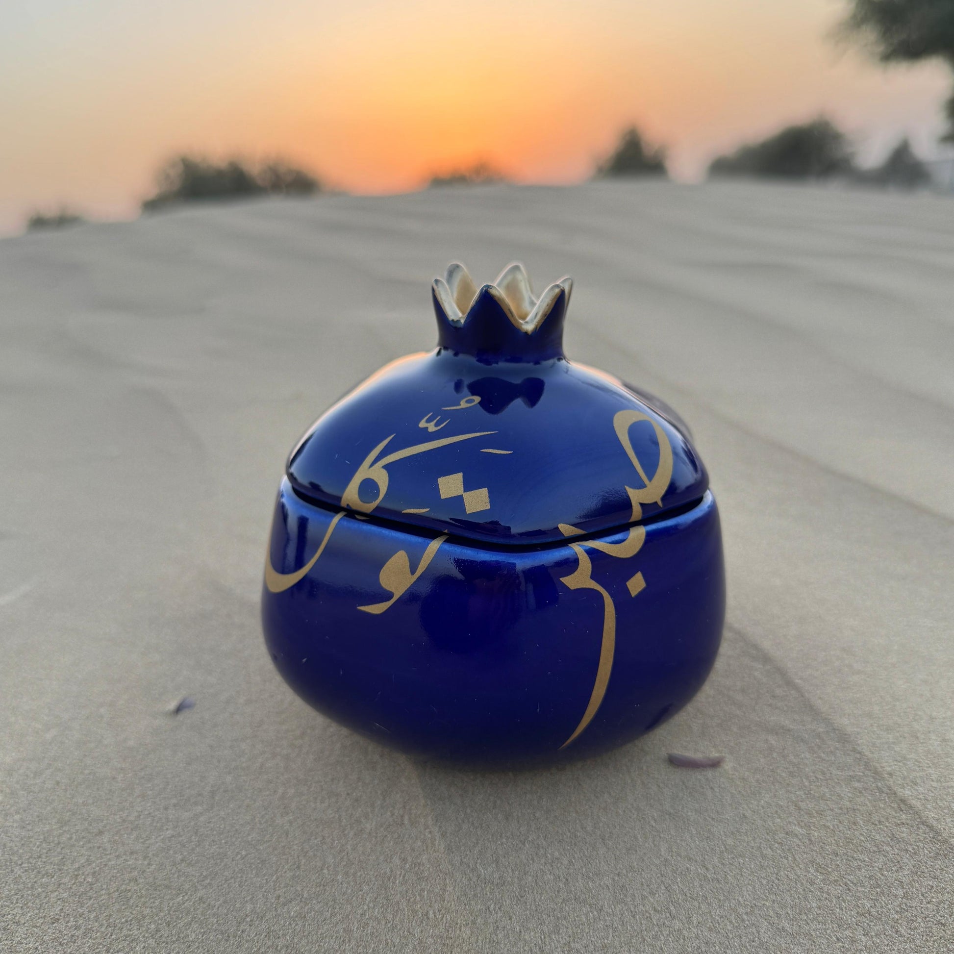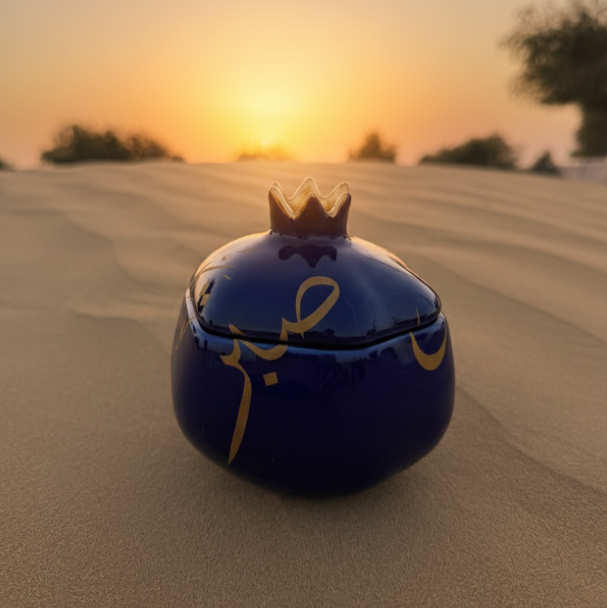The Lidded Ceramic Pomegranate by Tohfa Luxe is a masterpiece of cultural artistry and timeless elegance. Crafted in a rich majestic blue ceramic finish and adorned with gold hand-painted Arabic calligraphy, it beautifully displays the words “Sabr” (Patience) and “Tawakul” (Trust) — virtues that inspire resilience, calm, and faith in life’s journey.